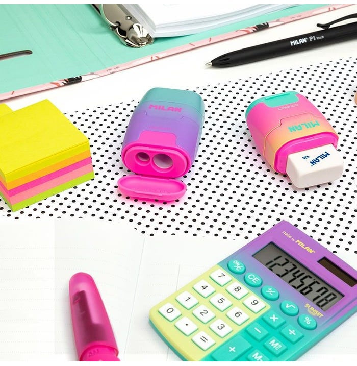Combination of eraser with double pencil sharpener (standard and MAXI sizes) with deposit. COMPACT design, Sunset series. Synthetic rubber square eraser. The pencil sharpener has a sharp and resistant steel blade which makes it ideal for all varieties of pencils. Safety blade system which prevents the blade from becoming detached from the body of the pencil sharpener.