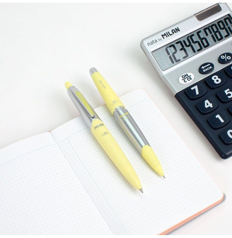 CAPSULE Slim eraser and mechanical pencil with clip. Silver series. 0.5 mm graphite lead HB hardness that can draw fine lines. Extra-long eraser. Available in 4 colors combined with a silver finish: navy blue, yellow, pink, turquoise.