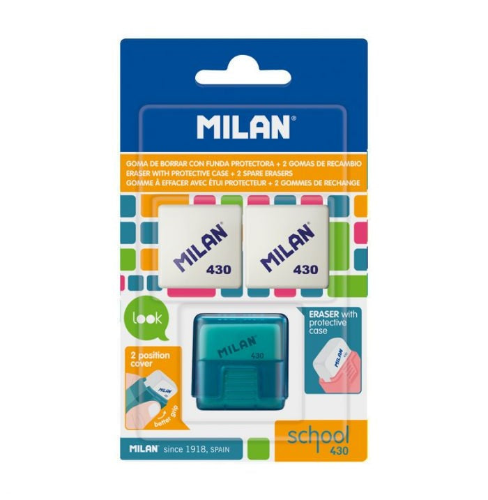 430 eraser with a protective case, available in 4 colour combinations: red, purple, green and yellow (Assorted). Includes 2 white spare erasers. 430: soft synthetic rubber eraser. It can be used to erase a wide range of graphite pencil strokes from all types of paper. Eraser size: 2.8 x 2.8 x 1.3 cm. MILAN erasers are manufactured in Spain since 1918.