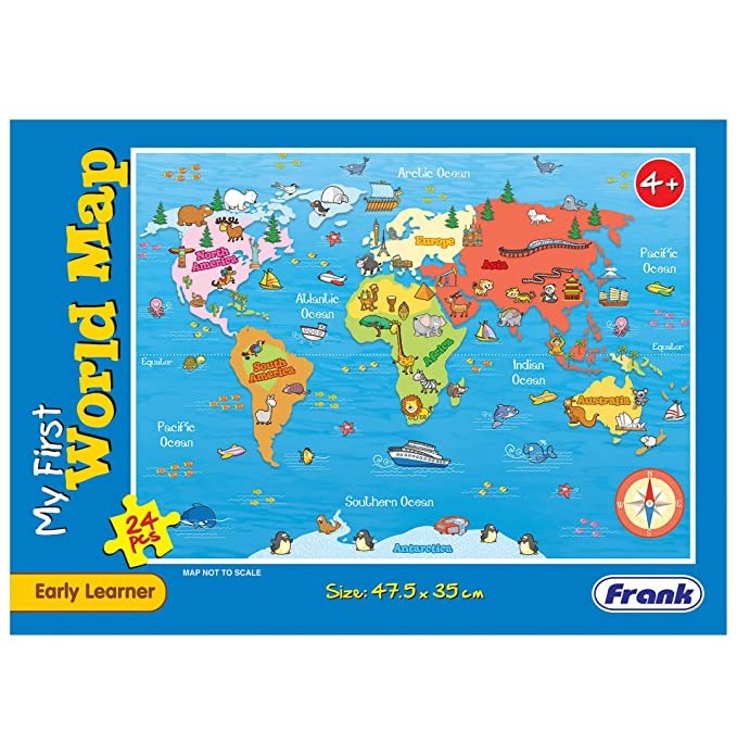 - PRODUCT SPECIFICATIONS: Frank My First World Map Puzzle consists of 24 jigsaw pieces and measures 35 x 47.5 cm once completed. It is suitable for children of 4 years and above.
