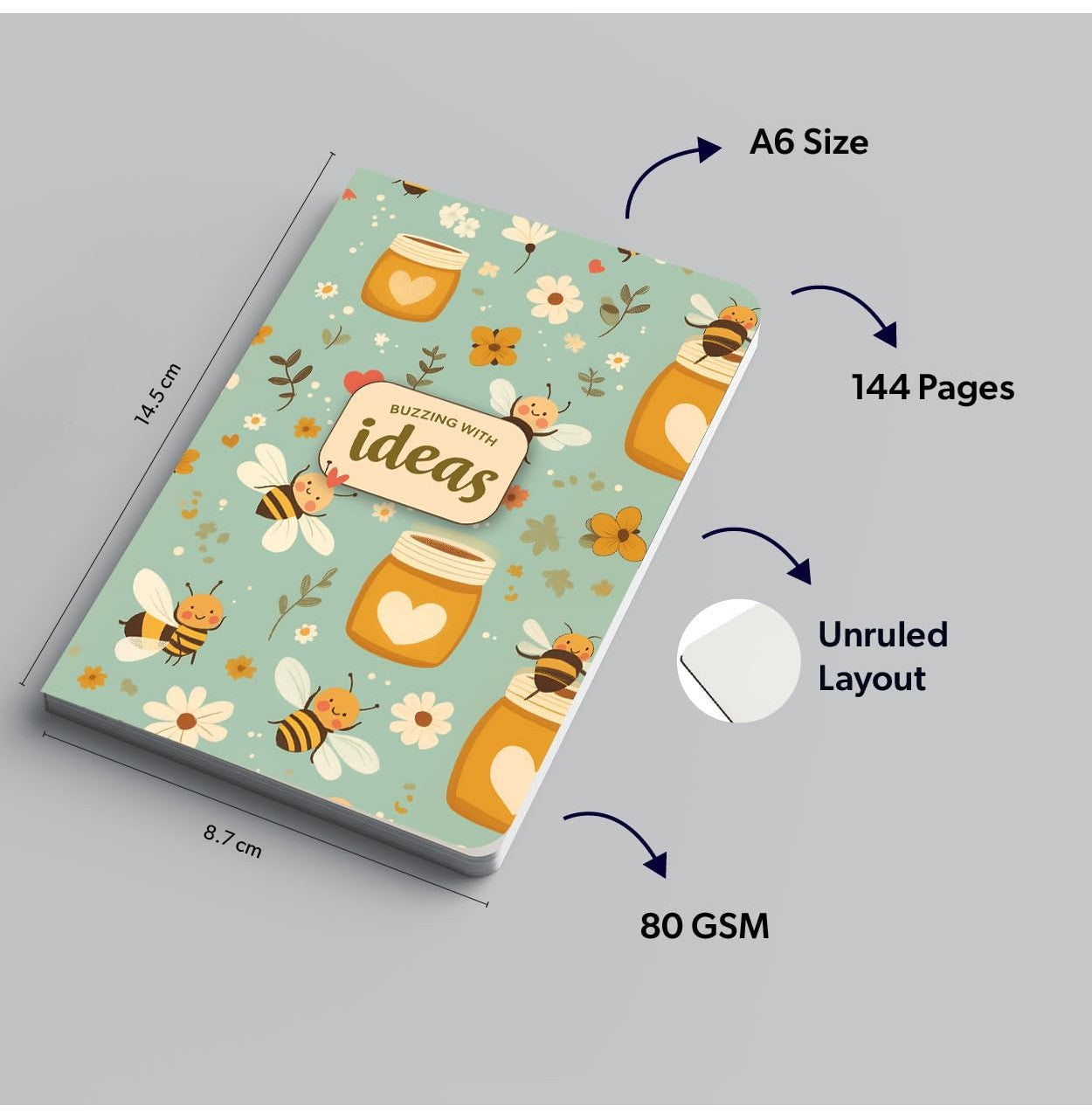 Let your creativity take flight with the "Buzzing with Ideas" notebook by Loope! With its cheerful bee-themed cover, adorable honey jars, and uplifting design, this notebook is your perfect companion for jotting down sweet thoughts, sketches, and spontaneous ideas. Compact and unruled, it's made for playful minds and artistic hearts.
