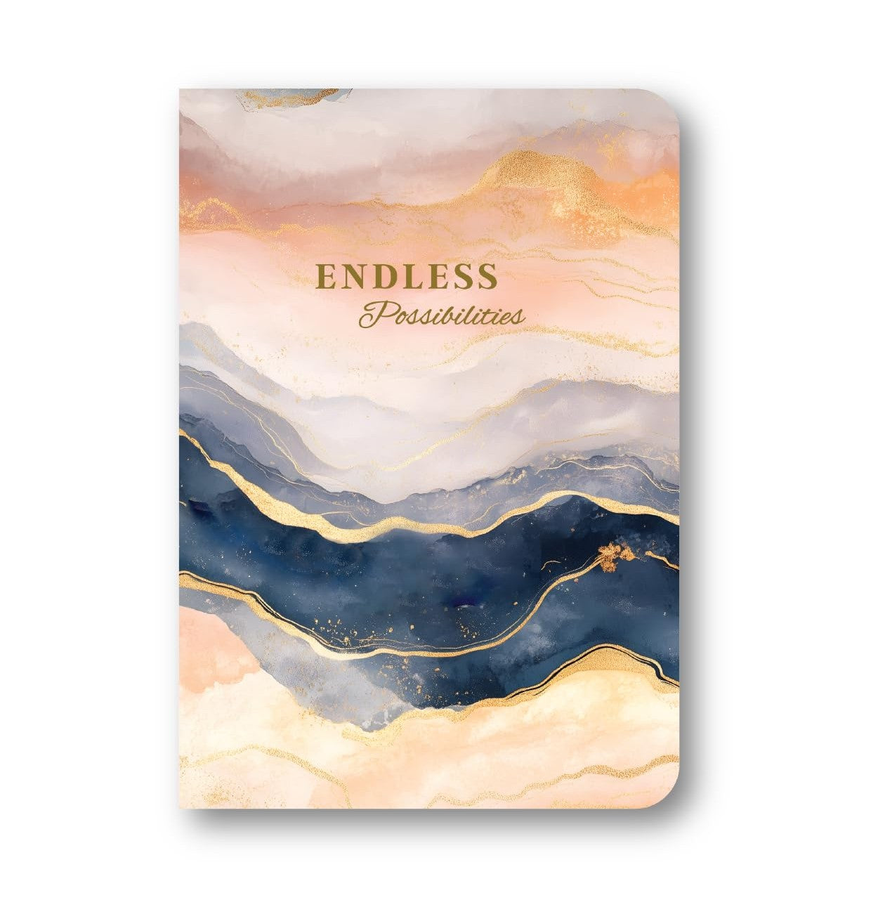 Elegant Marble-Inspired Design: Features a sophisticated abstract cover in pastel and navy tones with luxurious gold foil text “Endless Possibilities.”