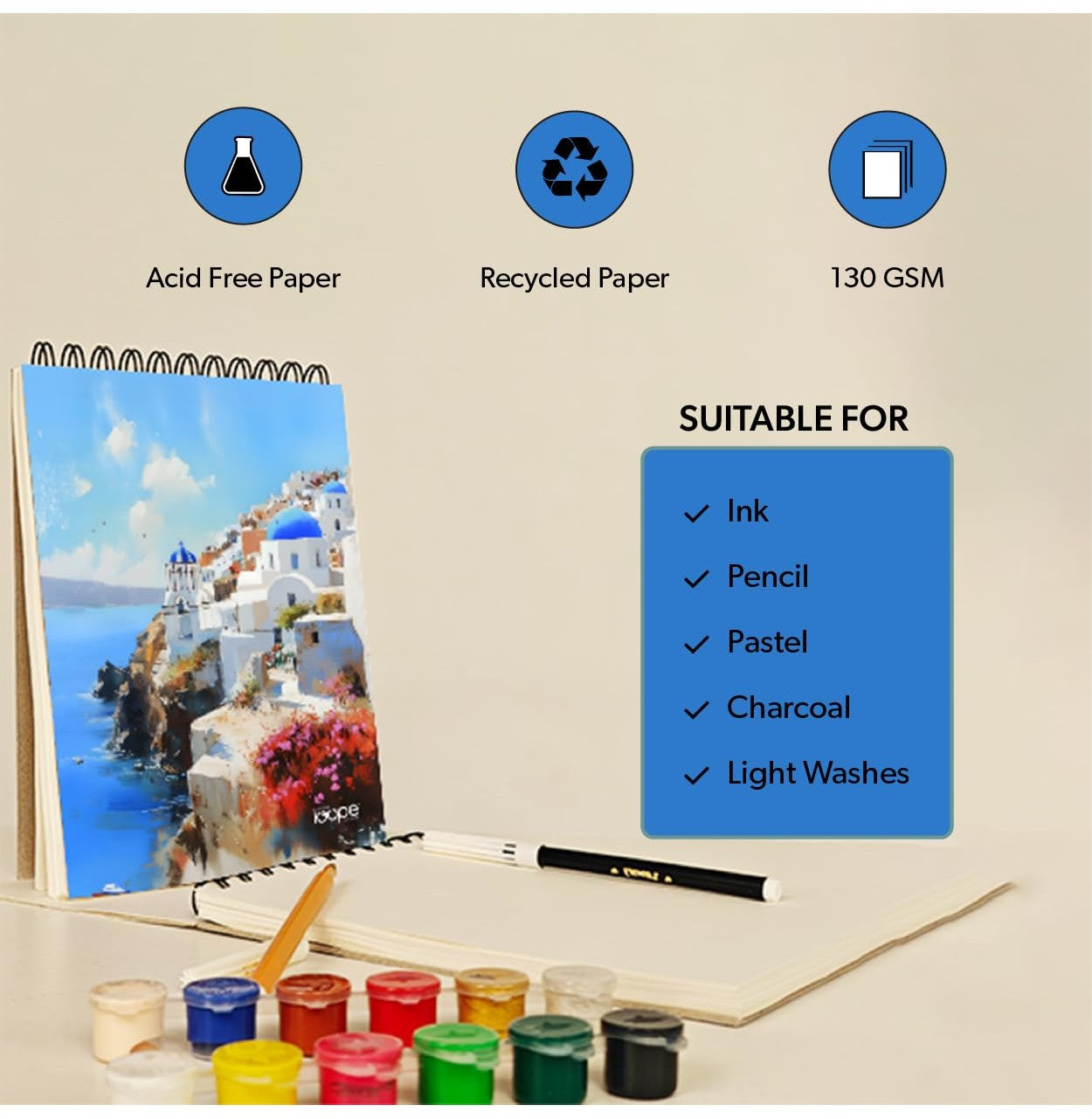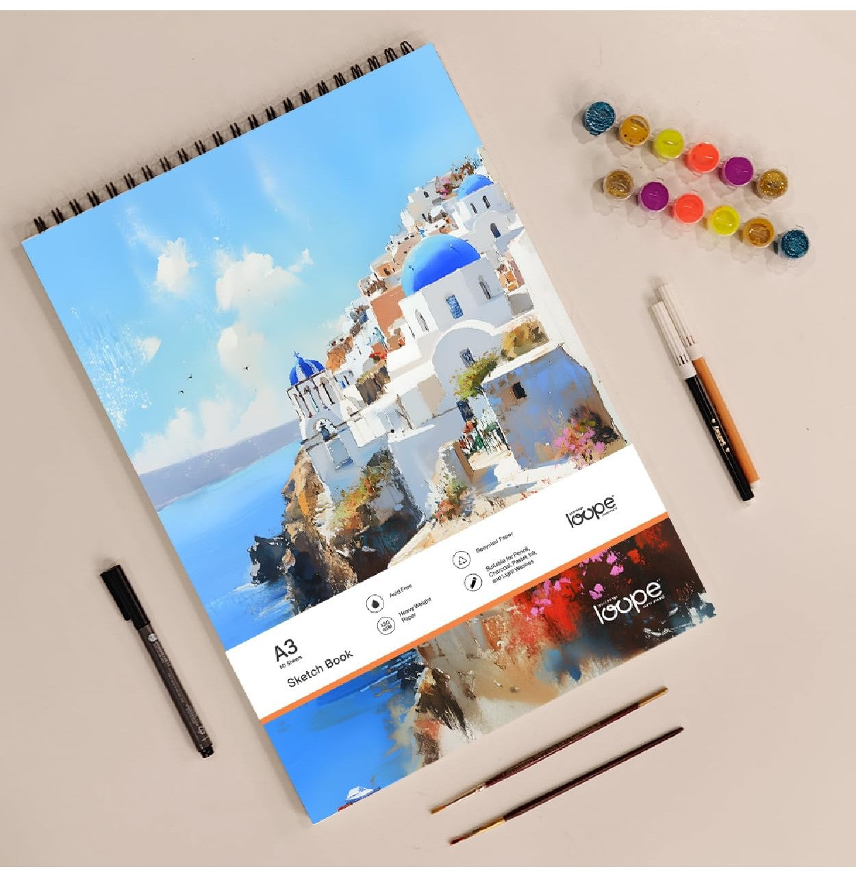 Elevate your creativity with the LOOPE A3 Sketch Pad – 50 Sheets (Greece Design). Made with 130 GSM premium acid-free and recycled paper, this sketch pad ensures durability, smooth texture, and eco-friendliness. The acid-free paper prevents yellowing over time, preserving your sketches and drawings for years. Perfectly compatible with ink, pencil, pastel, charcoal, and light watercolor washes, this versatile sketchbook is spiral-bound for convenience and features a scenic Greece-inspired cover that sparks inspiration. Ideal for students, hobbyists, and professional artists alike.