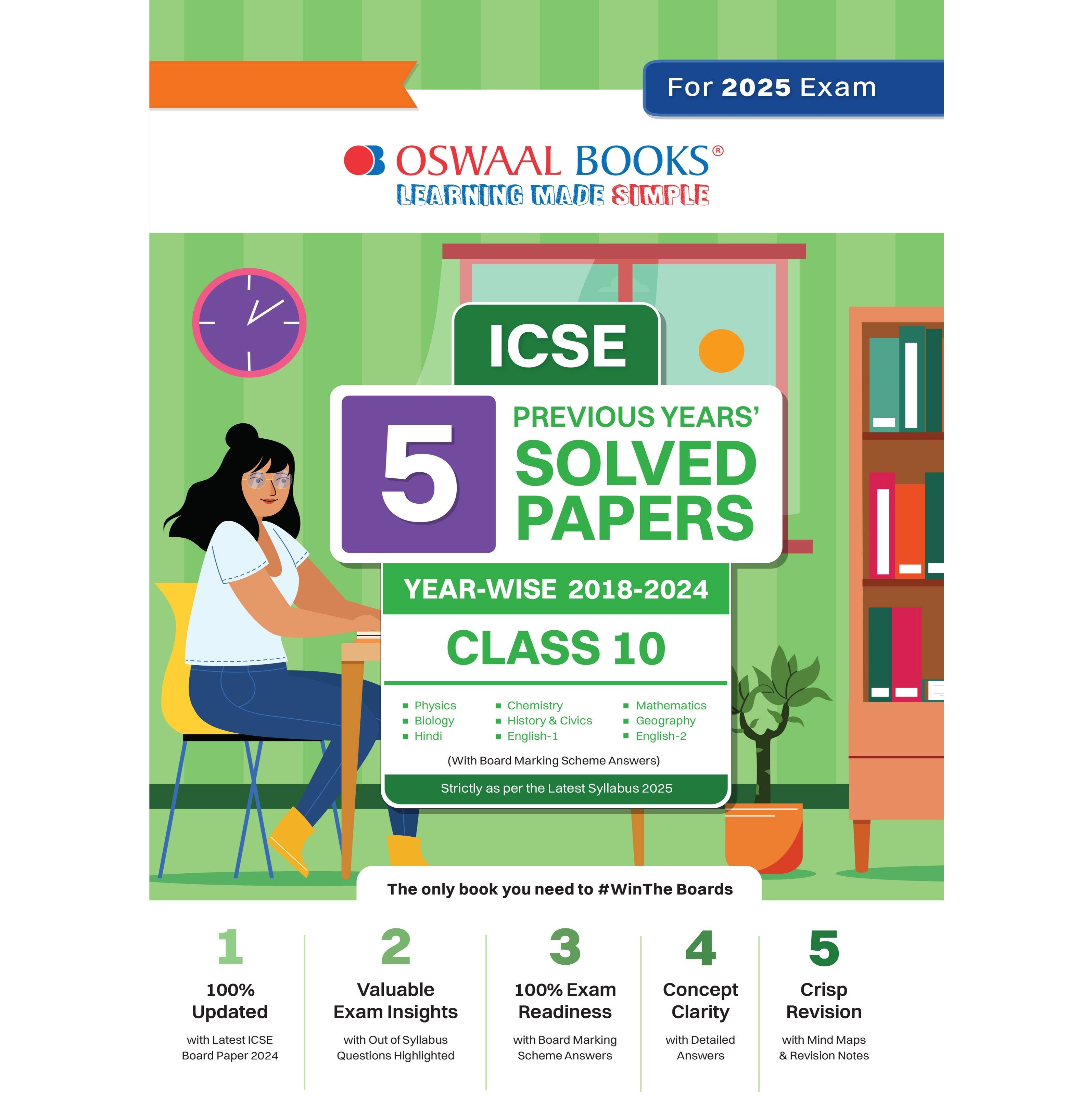 Oswaal ICSE 5 Previous Year Solved Papers Class-10 | Yearwise 2018-2024 (Physics, Chemistry, Maths, Biology, History, civics, Geography, Hindi, English 1, English 2) For 2025 Board Exam