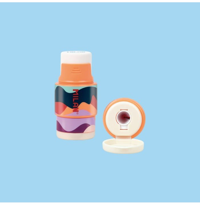 Combination of eraser with pencil sharpener with deposit. EXTENSION design, The Fun series. Flexible soft synthetic rubber eraser. The pencil sharpener has a sharp and resistant steel blade which makes it ideal for all varieties of pencils. Safety blade system which prevents the blade from becoming detached from the body of the pencil sharpener. Extensible deposit. Original design created by MILAN’s own R+D department. Assorted colours: orange, pink and blue. Spare erasers available.